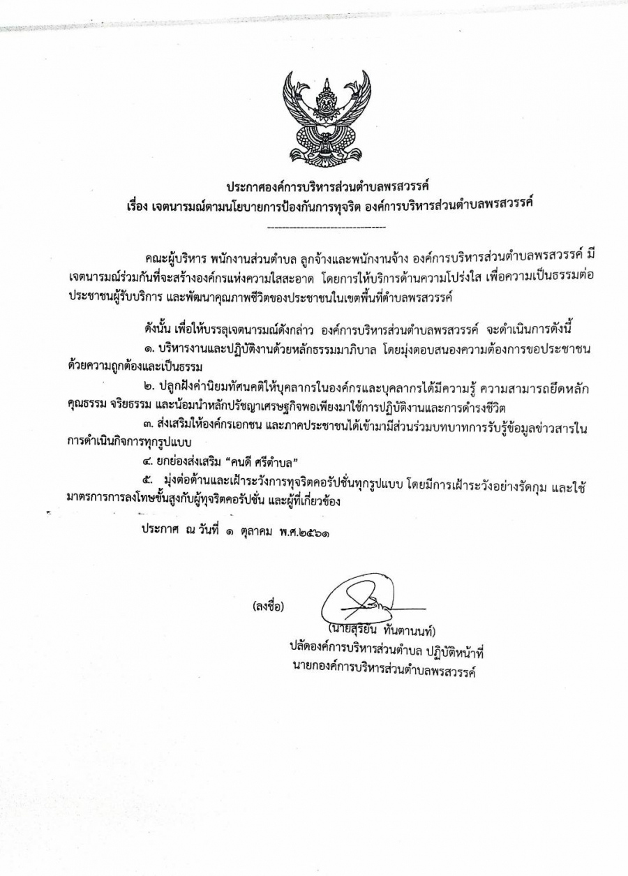 วันจันทร์, 01 ตุลาคม 2561 14:12 ประกาศเจตนารมณ์ตามนโยบายการป้องกันการทุจริต องค์การบริหารส่วนตำบลพรสวรรค์ Print Email back to top