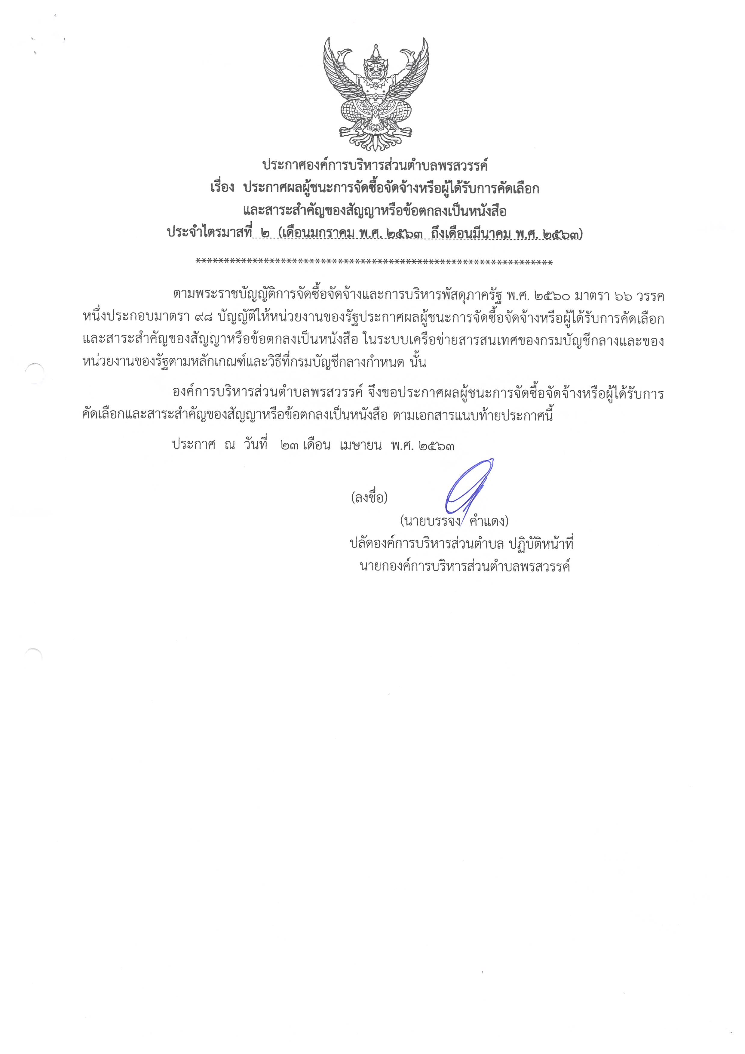 ประกาศผลผู้ชนะการจัดซื้อจัดจ้างหรือผู้ได้รับการคัดเลือกและสาระสำคัญของสัญญาหรือข้อตกลงเป็นหนังสือ ประจำไตรมาสที่ 2 (เดือนมกราคม พ.ศ. 2563 ถึงเดือนมีนาคม พ.ศ. 2563)