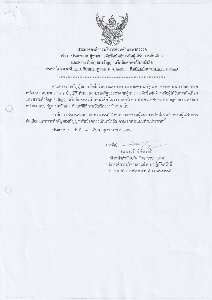 ประกาศ ผลผู้ชนะการจัดซื้อจัดจ้างหรือผู้ได้รับการคัดเลือกและสาระสำคัญของสัญญาหรือข้อตกลงเป็นหนังสือ ประจำไตรมาสที่ 4(กรกฎาคม - กันยายน 2563)