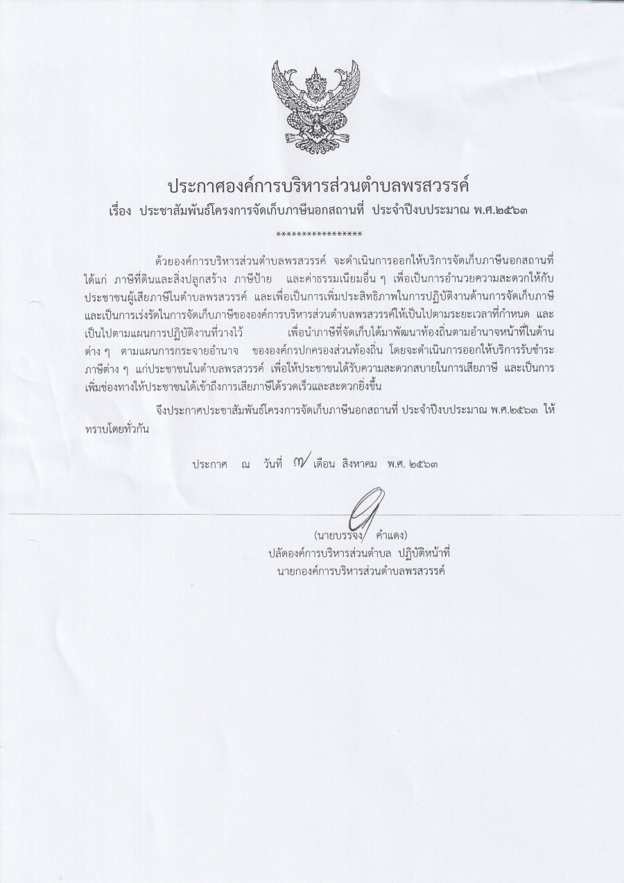 ประกาศ ประชาสัมพันธ์โครงการจัดเก็บภาษีนอกสถานที่ ประจำปี งบประมาณ พ.ศ.2563